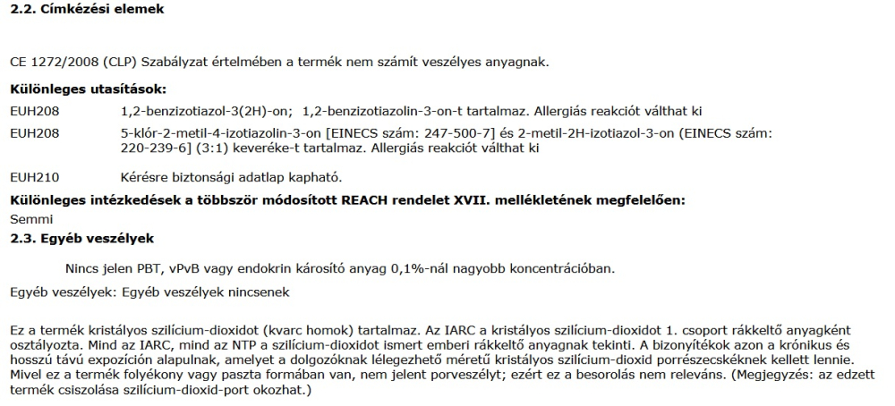 veszélyesnek sem a kivitelező, sem a végfelhasználó számára. Minden különösebb óvintézkedés nélkül tárolható.